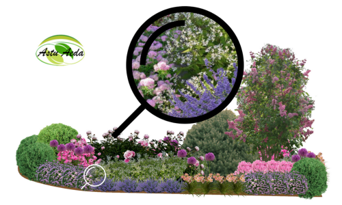 Kujunduspildil on kõik õitsvad taimed kujutatud õitega, et näidata ära taime dekoratiivsus. Õiteilu jagub kasvuperioodil istutusala erinevatesse osadesse ja eri aegadele. Lisage kindlasti taimede vahele kevadisi sibullilli.