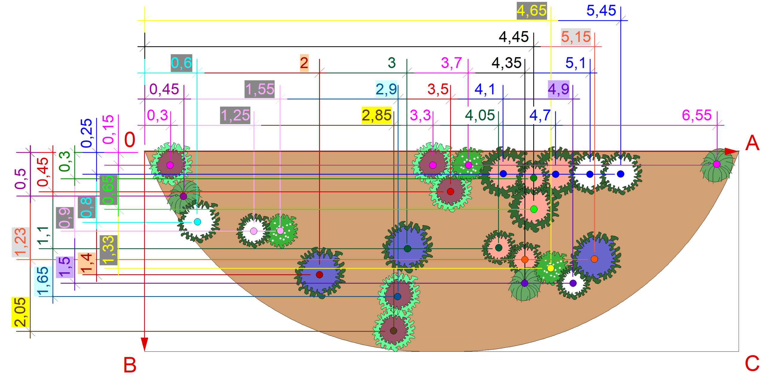 - istutusskeemidel on näidatud taimede nimetused, taimede järjekorra numbrid taimenimekirja järgi ja asukoha mõõdud sirgel 0A ja sirgel 0B